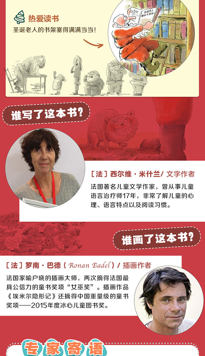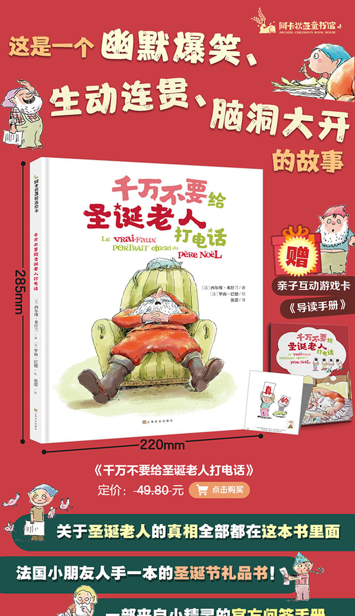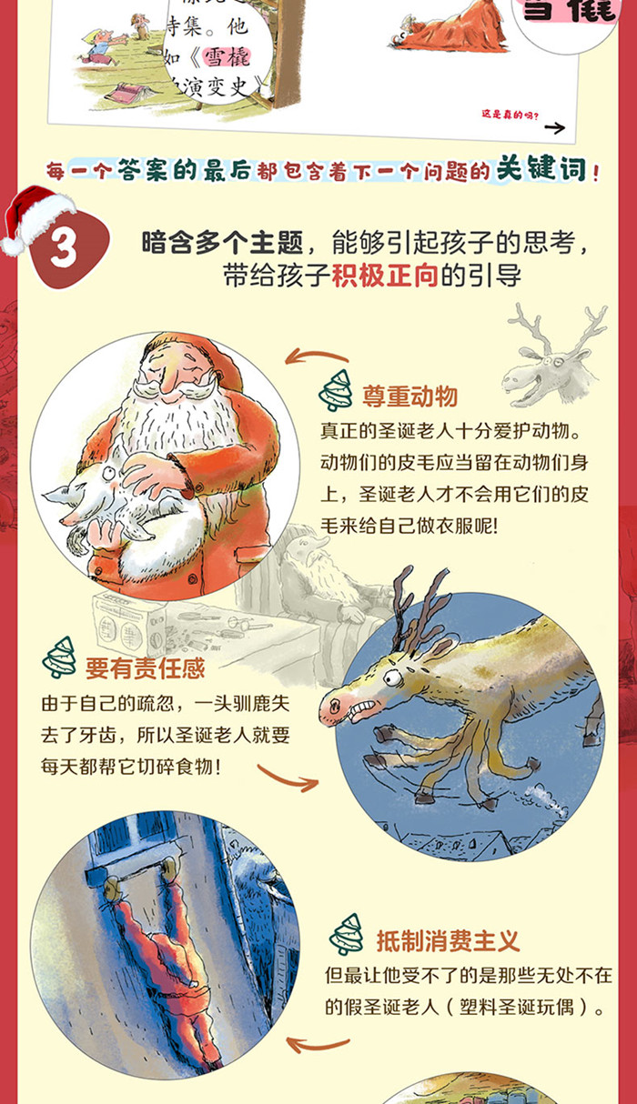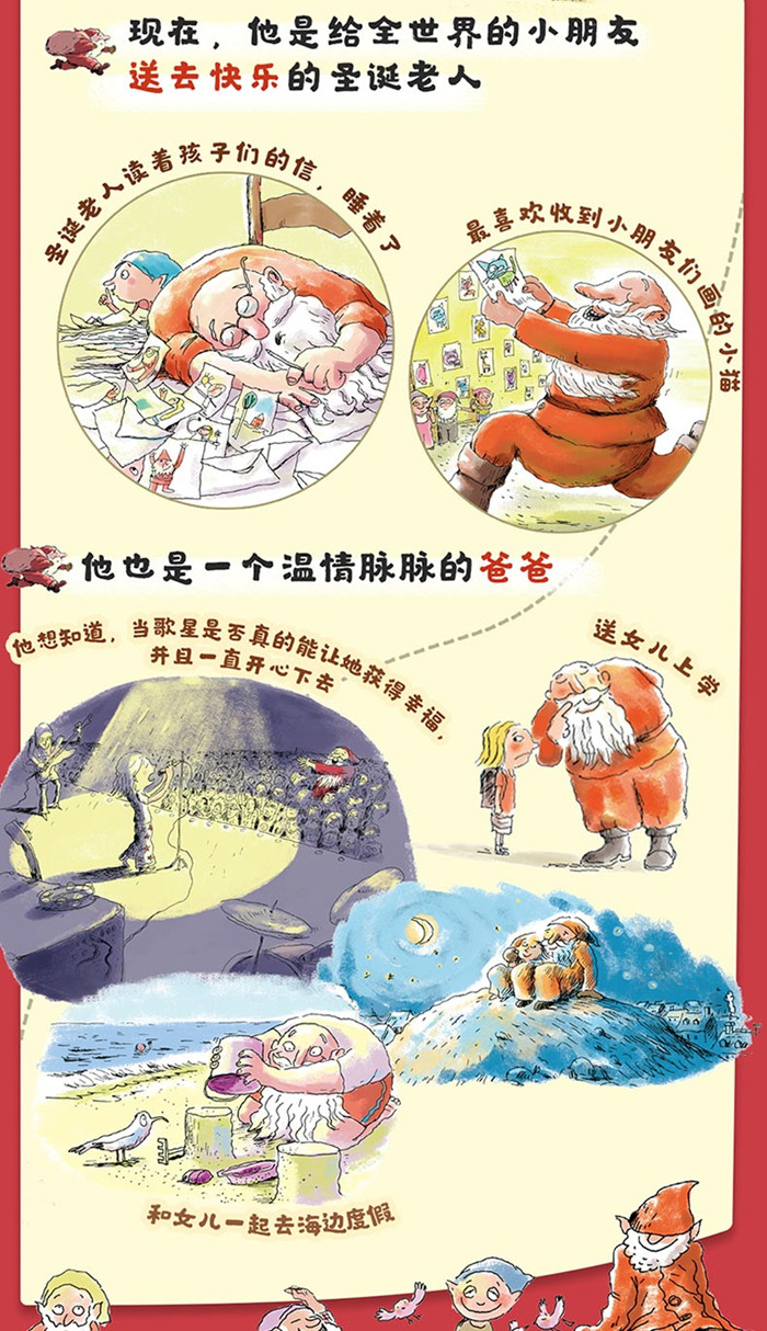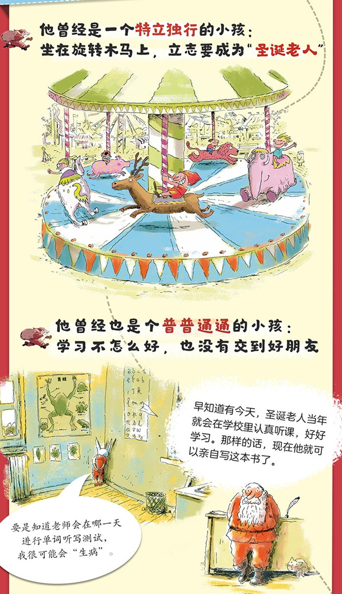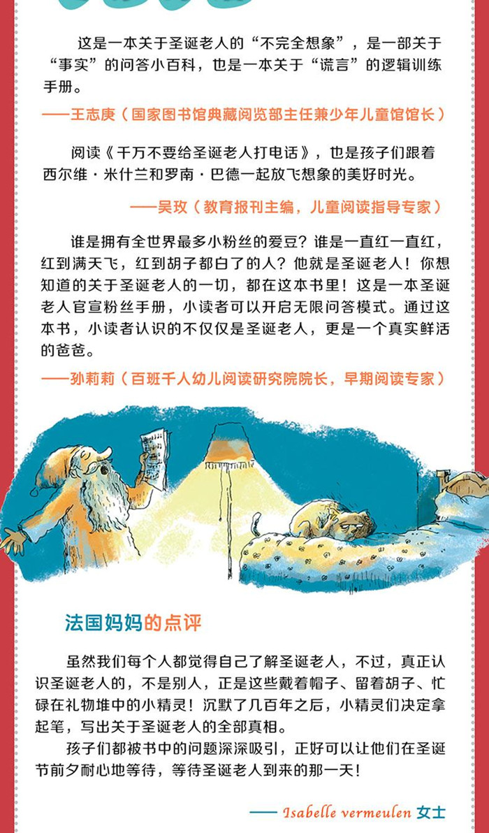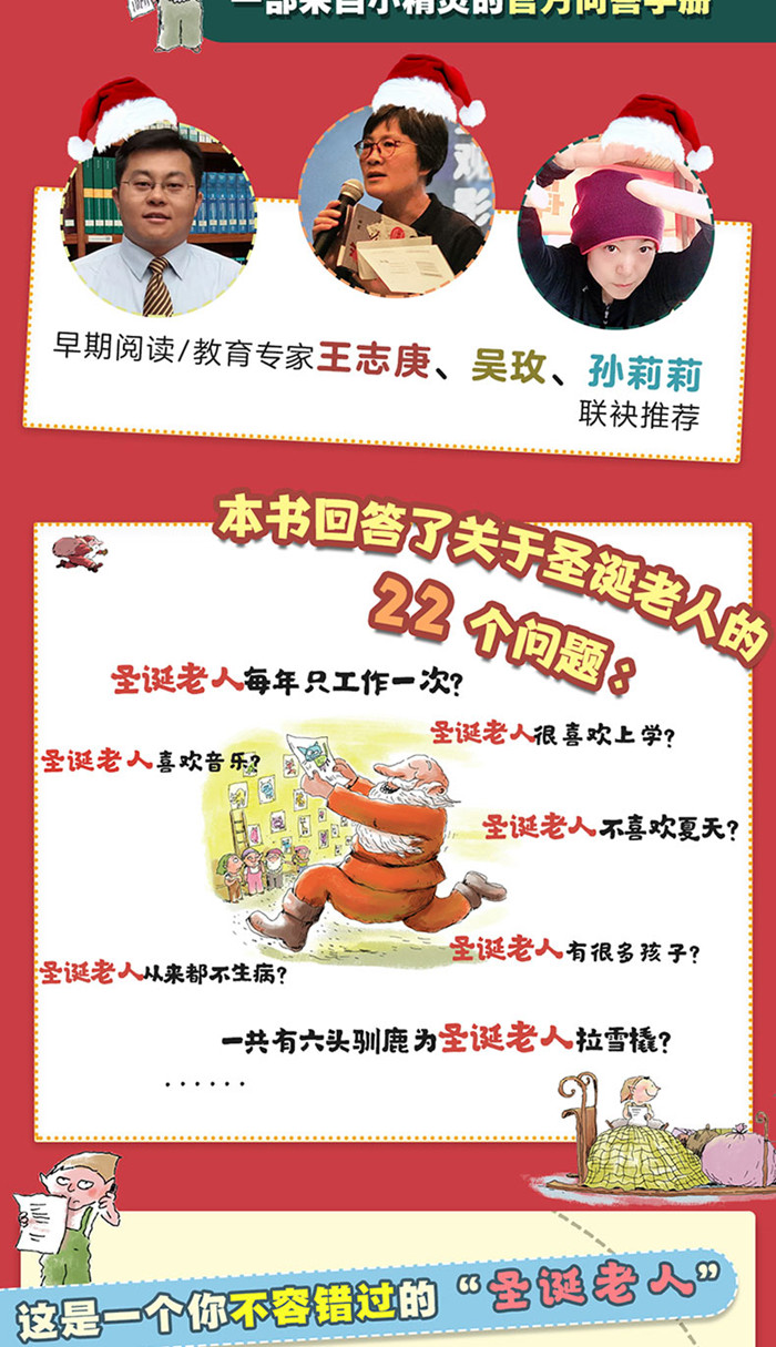 这是一本跳出条条框框、脑洞大开、幽默爆笑的创新型儿童绘本。通过圣诞老人身边的小精灵们的口吻,“官方澄清”了关于圣诞老人的种种传闻,告诉孩子哪些传闻是真的、哪些传闻是假的,打破圣诞老人的神秘,还原一个“真实的、普通的”圣诞老人的形象。 全书采取一问一答的形式展开,逐一列出了小朋友关于圣诞老人的22个问题。比如: 圣诞老人每年只工作一次吗?圣诞老人有很多孩子吗?圣诞老人所有的衣服都是红色的吗?还有小朋友们关心的问题:我们可以给圣诞老人打电话吗?所有这些问题都能在这本书里找到答案。