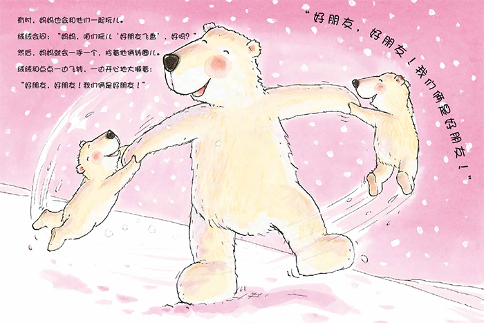 小熊绒绒长大了,不能整天和妈妈在一起玩儿了。妈妈鼓励绒绒去找朋友。绒绒找啊找,他碰见了一只海鸥、一头小海豹、一大群黑压压的企鹅,还有一只老海象,可这些都适合做绒绒的朋友。最后,绒绒碰见了一个和自己长得一摸一样的小朋友,噢,原来这才是他的朋友。