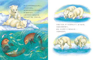 在妈妈的关心和爱护下,两只北极熊宝宝尝试着迈出了投入大海怀抱的第一步。他们能学会游泳吗?