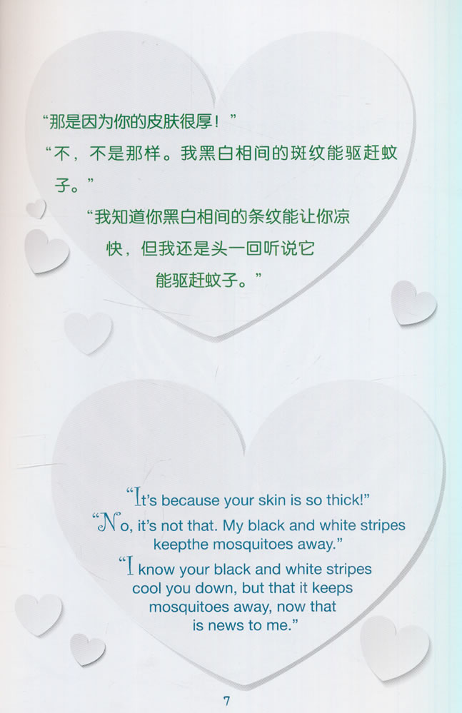 “那是因为你的皮肤很厚!”“不,不是那样。我黑白相间的斑纹能让蚊子无法接近。”“我知道你黑白相间的条纹能让你凉快,但我还是头一回听说它能让蚊子无法接近。”