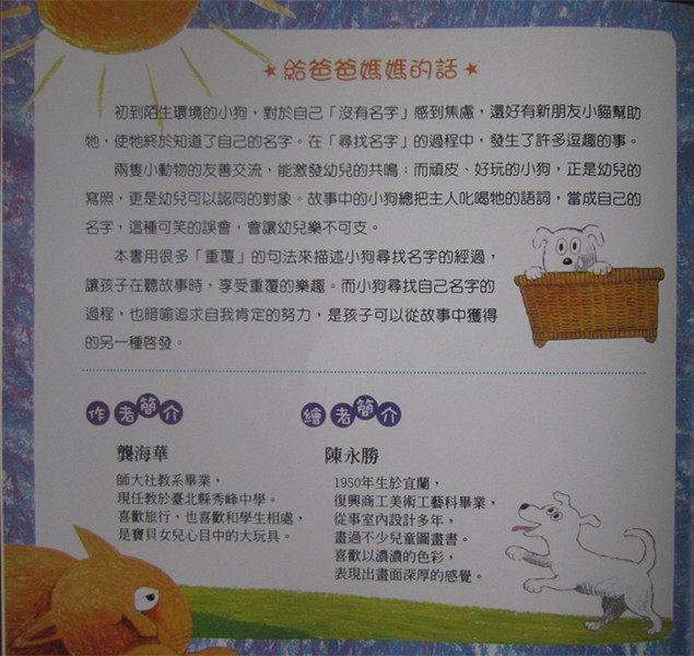 有一隻可愛的小狗,不知道自己的名字,當貓咪毛毛問他時,他縂是回答不出来。好幾次當主人叫他時,都誤以爲自己的名字叫“不行,不行”或“調皮,調皮”·····。透過生動有趣的對话,引發好奇舆探究,猜猜看,到底小狗叫什麽名字呢?