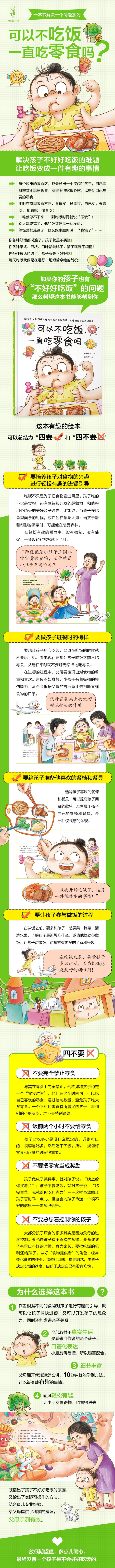 这是一本专为3-6岁儿童量身打造的亲子共读绘本。 “来,吃一口”左歪头,继续玩。 “乖,不要吃零食了”右歪头,继续吃。 “饭都凉了,你到底吃不吃?”家长怒吼, “哇……”孩子大哭或者大叫。 每天哄孩子吃饭比登天还难,无论是软磨硬泡的哀求,还是声色俱厉的恐吓,孩子就是不买账。 于是,家长只能满世界跑着、追着、吼着喂,结果家庭氛围特别不好,而且还可能会让孩子更加抵触吃饭。 那么,如何让孩子自觉地吃饭呢? 这本书里有你想要的答案。