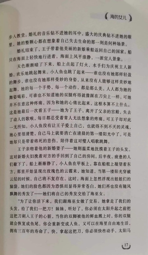该作品讲述了海公主小人鱼放弃海底生活和长寿的生命,以美妙的歌喉为代价,从巫婆手里换取把鱼尾变成人腿的机会。