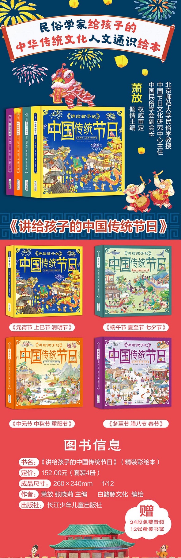 中国民俗专家萧放、张晓莉权威主编,专业童书绘画团队匠心绘制,好看好听又好玩的传统文化通识绘本,让孩子传承中华优秀文化,做知节日懂节礼的小小少年。 12个中国传统节日、12段节日历史故事、12首节日古诗词、12首经典节日童谣,结合课本延伸阅读,帮助孩子拓展知识、开拓视野,助力大语文学习。