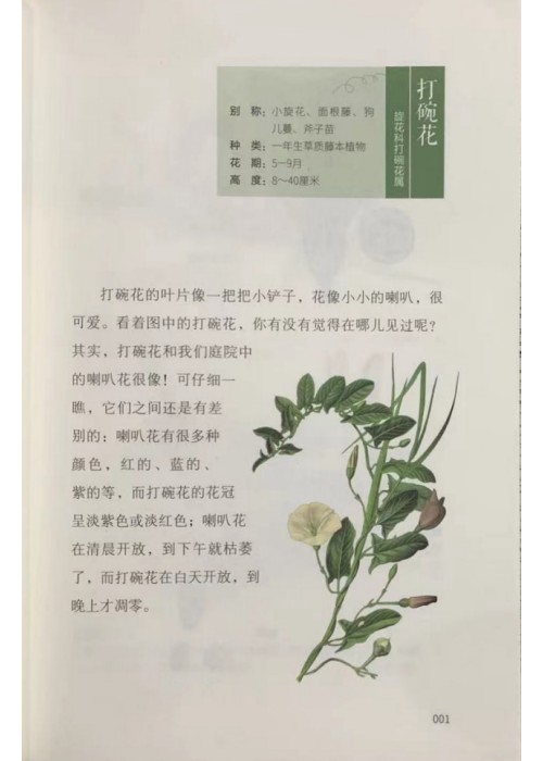 打碗花的叶片像一把把小铲子,花像小小的喇叭,很可爱。看着图中的打碗花,你有没有觉得在哪儿见过呢?其实,打碗花和我们庭院中的喇叭花很像!可仔细瞧,它们之间还是有差别的:喇叭花有很多种颜色,红的、蓝的、紫的等,而打碗花的花冠呈淡紫色或淡红色;喇叭花在清晨开放,到下午就枯萎了,而打碗花在白天开放,到晚上才凋零。