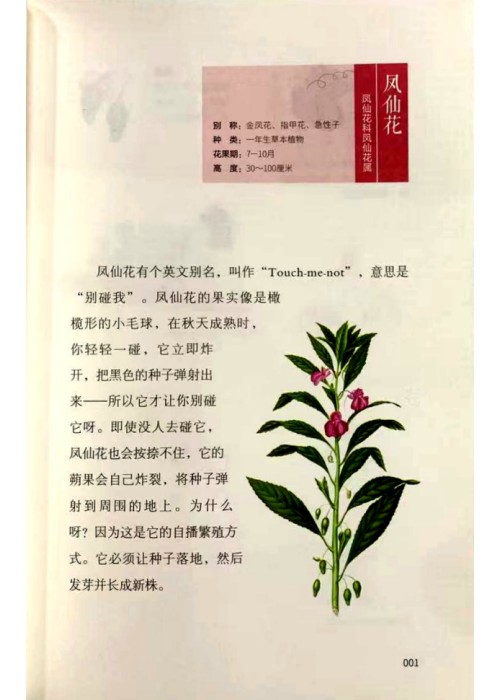 凤仙花的果实像是橄榄形的小毛球,在秋天成熟时,你轻轻一碰,它立即炸开,把黑色的种子弹射出来-所以它才让你别碰它呀。即使没人去碰它,凤仙花也会按捺不住,它的荫果会自己炸裂,将种子弹射到周围的地上。为什么呀?因为这是它的自播繁殖方式。它必须让种子落地,然后发芽并长成新株。