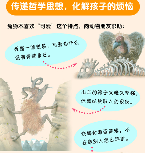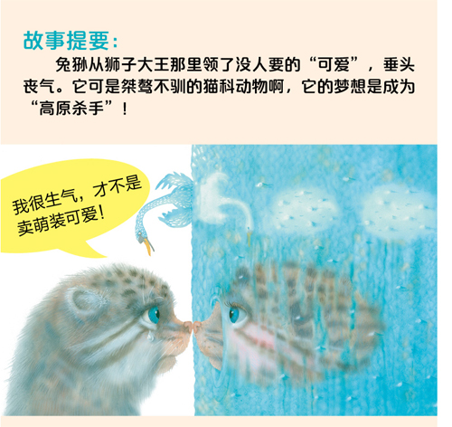 自称“高原杀手”的兔狲,有着霸气、凶悍的本性,却因为毛茸茸、圆滚滚、软萌萌的外表,被贴上了“可爱”这个标签。它能成功甩掉这个自己不喜欢的标签吗? 这是一个以兔狲为主角,启发读者建立自我认同、培养自信心的绘本。狮子大王要把不同的特点赋予给各种动物。自称“高原杀手”的兔狲,却领到了自己很不喜欢的标签——“可爱”。苦恼的兔狲,遭到了天鹅的嘲讽,他生气的样子却被天鹅吐槽成“卖萌”。兔狲向动物朋友们求助。秃鹫说,可爱没什么不好。山羊说,离那些以貌取人的家伙远点儿!蜣螂反问他为什么要在乎别人怎么看呢?最后,野马的一席话让兔狲解开了心结,他决定,就做荒原上呆萌的小胖墩儿!