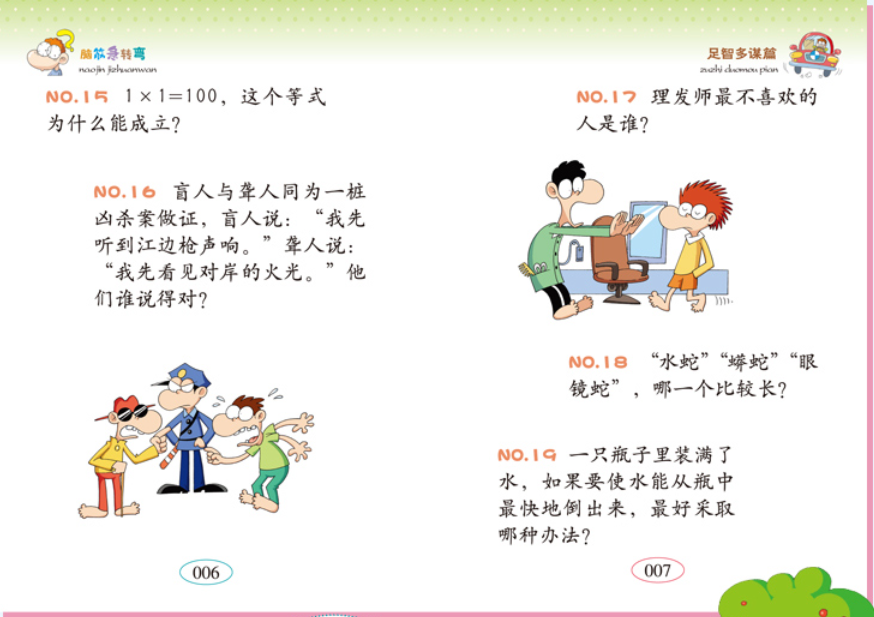 《小小口袋书:脑筋急转弯(套装共4册)》精选了一千多条积极、正向、有品位、有内涵的经典脑筋急转弯题目。其中,有的比较简单,只需要采用逆向思维的方法,便可迎刃而解;有的则较难,需要具备较强的逻辑推理能力;有的很有趣,让你从中领略幽默的智慧与知识的奥妙;有的看上去扑朔迷离,需要旁敲侧击,歪打才能正着……精彩的题目,配上精美的彩色插图,以及精巧的版式设计,无疑是培养孩子创新型、发散型、跳跃型思维最好的工具,可以很好地帮助孩子打破传统的固有思维模式,摒弃陈旧的思想观念,为其能成为一流的人才而打下坚实的基础。