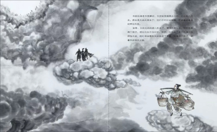 不知何时投生成牛郎的牵牛悄悄来到了河边,猛地抓起织女的衣服撒腿就跑。