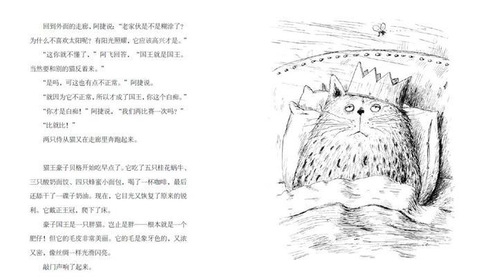 猫王豪子贝格开始吃早点了。它吃了五只桂花蜗牛、三只酸奶面饺、四只蜂蜜小面包,喝了一杯咖啡,最后还舔干了一碟子奶油。现在,它目光又恢复了原来的锐利。它戴正王冠,爬下了床。
