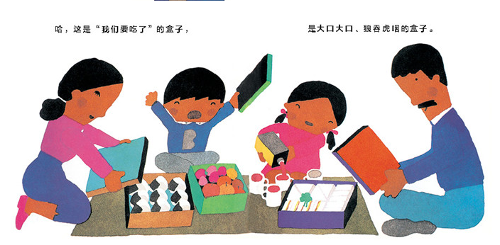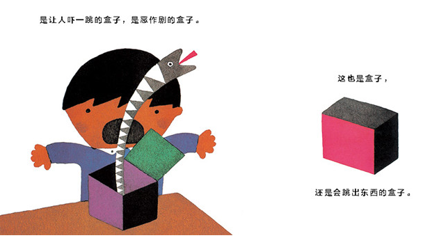 是装礼物的盒子。这是盒子,是会跳出香喷喷烤面包的盒子。这也是盒子,是凉冰冰的盒子,打开时间太长,会惹爸妈生气哦。这个也是盒子,是能移动的盒子,大家可以坐进去, 一起去兜风!