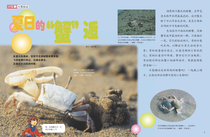 在夏日的海岸,常常可见到螃蟹举着双螯,飞快地横行而过。当潮水退去,正是它们活跃的时候!