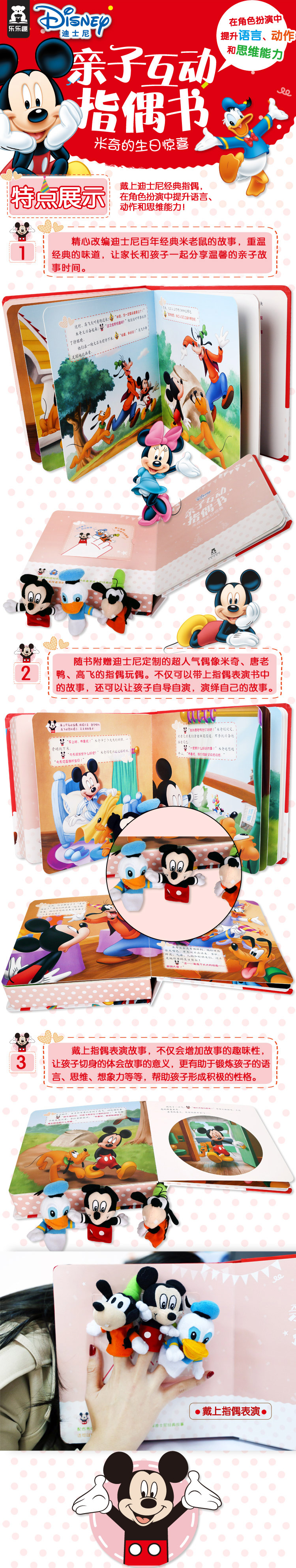 2. 随书附赠迪士尼定制的超人气偶像小熊维尼、跳跳虎、小猪、米奇、唐老鸭、高飞的指偶玩偶。不仅可以带上指偶表演书中的故事,还可以让孩子自导自演,演绎自己的故事。