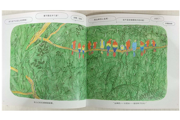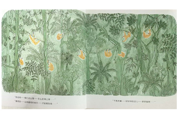 这本绘本细致地描绘了热带雨林和生活在其中的动物们,《慢悠悠,快点呀!》是为了将树懒们慢悠悠爬树的行动节奏和想到快点看到“丛林大花伞”的期待心情进行对比,形成了很大的戏剧张力。