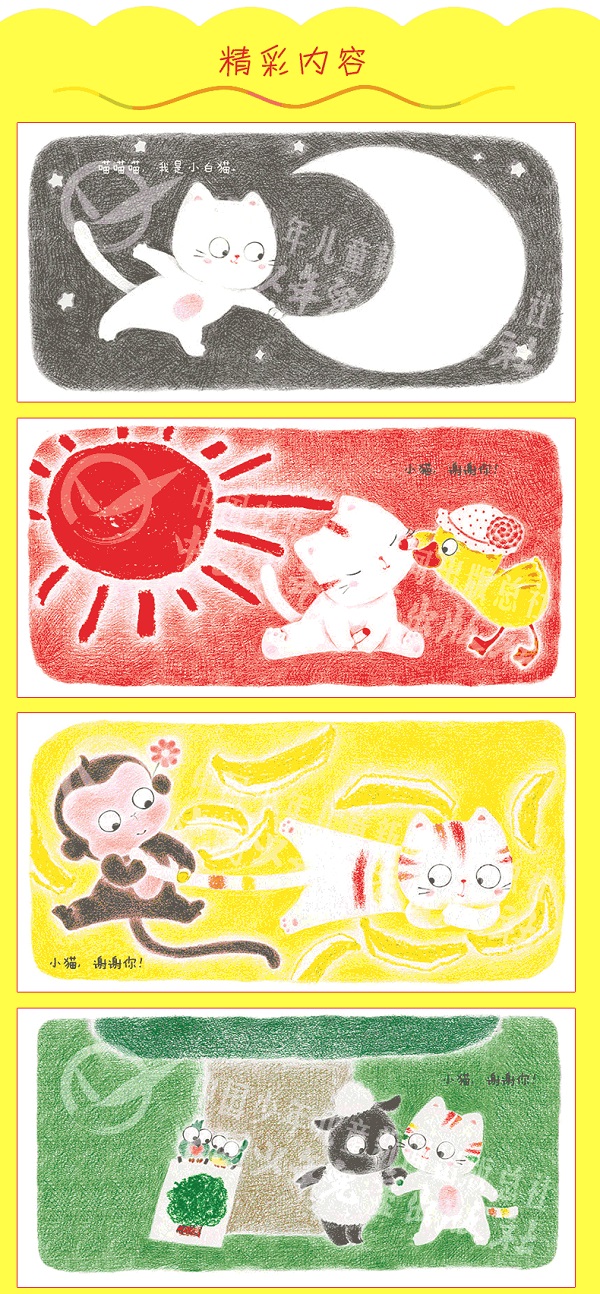 1.这是一本在友爱中认知颜色的图画书。小动物们爱画画,喵喵叫的小白猫热心来帮忙。送小鸭一把太阳伞,送小兔一根胡萝卜,送小猴一朵小花……小动物们也送了小白猫礼物,这些礼物,让小白猫*后变成了一只小花猫!2.这是一本带宝宝认知颜色的图画书。黑、白、红、橙、黄、绿、蓝、紫,在故事中认知基本颜色,并认识这些颜色的代表事物,让宝宝轻松认识颜色。 3.这是一本有趣的艺术启蒙图画书。宝宝拿起喜欢的彩笔,来画一画自己喜欢的东西吧。更多精彩小绘本: 《小鸡叽叽叽》 《荡秋千》 《好痒,好痒》 《月亮说晚安》 《小白猫,喵喵喵》 《不好,鼓起来!》 《嘘!别出声》 《像什么?》