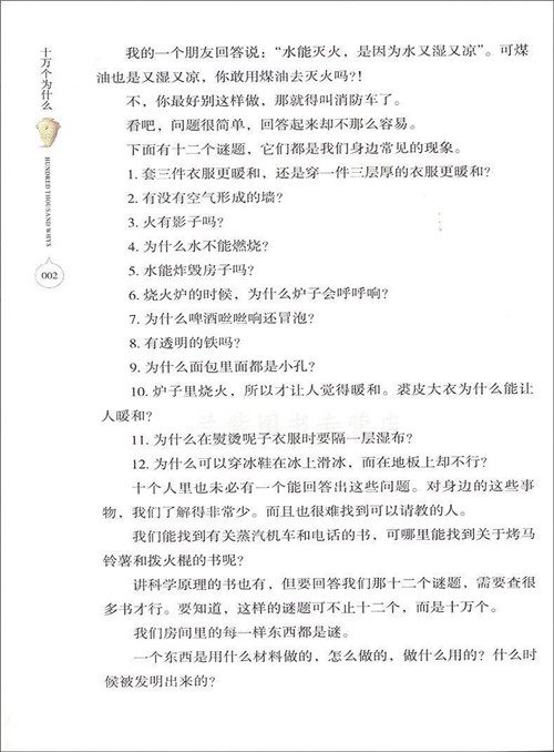 书中将生活中部分常见的事物一一给我们作了详细的介绍,而针对常见事物提出的问题更能激发人们的好奇心。这些问题大家都会遇到却视而不见,看似简单却不易回答,无独有偶,这种提问方式恰好迎合了儿童见什么问什么的好奇天性。