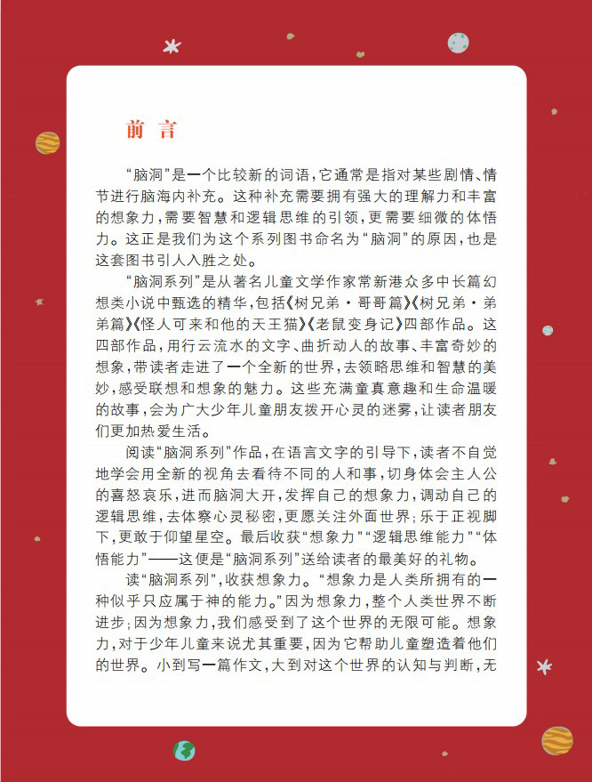 “脑洞系列”是从著名儿童文学作家常新港众多中长篇幻想类小说中甄选的精华,包括《树兄弟 哥哥篇》、《树兄弟 弟弟篇》、《怪人可来和他的天王猫》和《老鼠变身记》四部作品。