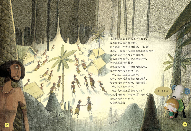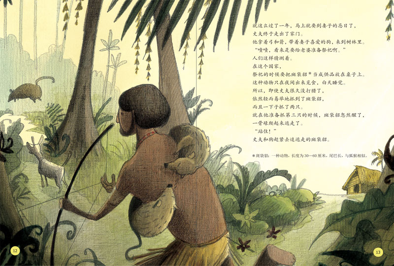 这是来自巴布亚新几内亚的童话故事,本书插画用丙烯颜料绘制而成,先在画布上涂上一层厚厚的颜料,再用酒精擦拭,使作品具有木头的质感。