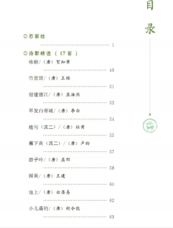 本书主要由古典国学精华《百家姓》及部分唐诗构成,其中唐诗主要有 《朝发白帝城》《池上》 《游子吟》《塞下曲(其二)》《春夜喜雨》《清明》《咏柳》《竹里馆》《宿建德江》《江雪》《村居》等,并配有相应的故事及图片,图文并茂,形象生动。
