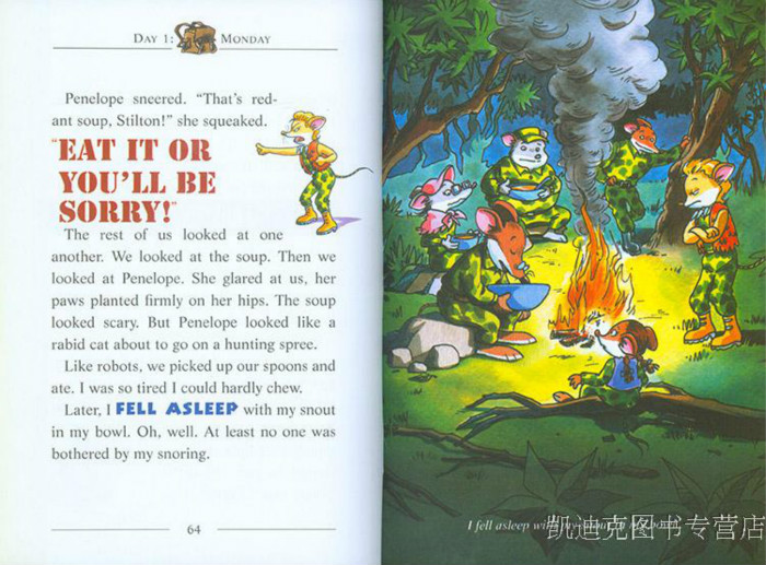 本书讲述了Geronimo最近遇到一个严重的问题:他恐惧一切,变得神经兮兮的。Thea、Trap和Benjamin出于对Geronimo的健康考虑,决心帮助他克服这个毛病。他们诱骗他签了一份合同,逼他去参加一个名叫“鼠胆神威”的热带丛林训练课程。于是,Geronimo不得不和其他四个倒霉的鼠友一起背着超重的行囊徒步走在阴森森的原始热带丛林里,还得不断接受各种出其不意的非鼠的挑战。当最后圆满完成挑战任务时,Geronimo已经脱胎换骨,他克服了所有胆小恐惧的毛病,”当然他还是害怕猫,因为他是一只老鼠嘛!
