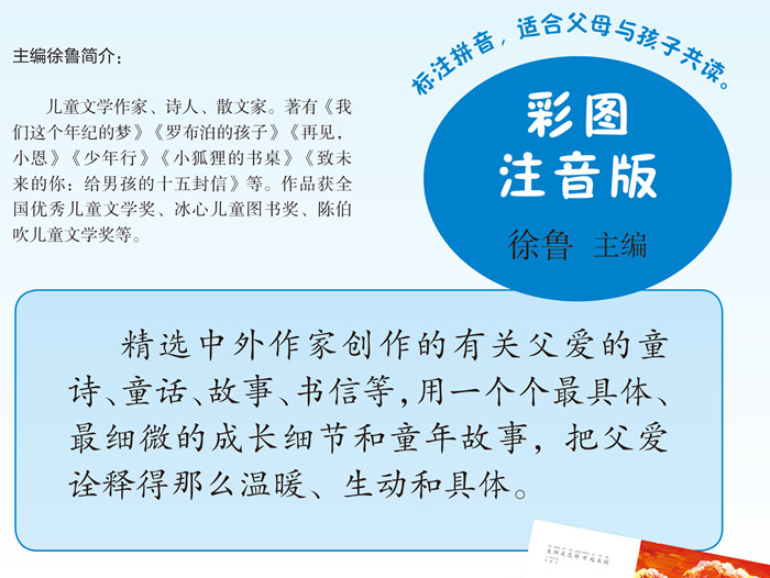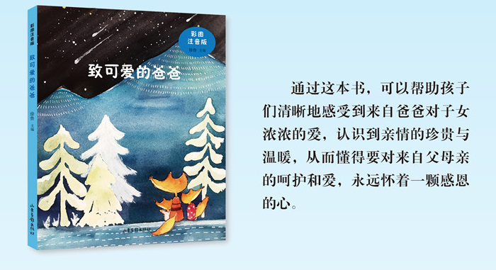 《致可爱的爸爸》,由著名儿童文学作家徐鲁选编,精选了中外作家、诗人创作的有关父爱的童诗、童话、故事、书信等,标注拼音,并配以孩子们充满想象力的画作,按照小读者的年龄段编辑成书。这些故事和诗歌,从不同的视角,用一个个*体、*细微的成长细节和童年故事,把父爱诠释得那么温暖、生动和具体。