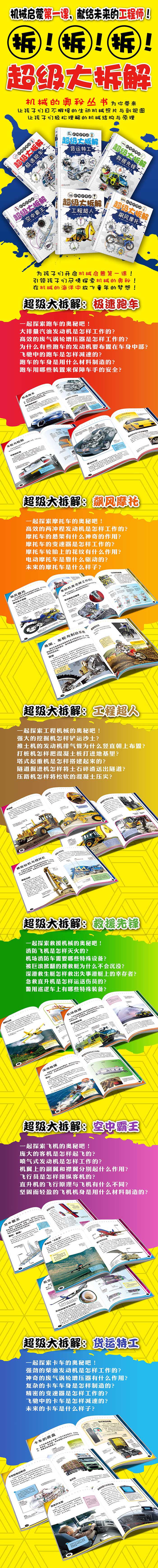 《超级大拆解:货运特工》将大量直观、生动的剖视图与简洁、通俗的文字结合,详细讲解了不同种类卡车的结构特点和工作原理,并穿插有大量趣味性常识,旨在帮助家长与孩子互动学习机械常识。本书适合6-12岁小朋友阅读。