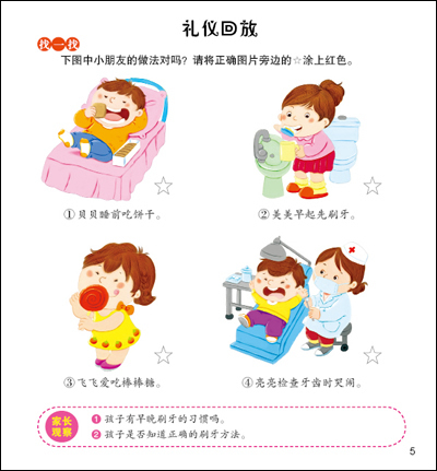 要让幼儿成为一个讲文明、懂礼貌的人,使幼儿拥有一个健全的人格和自信的人生,早期的引导和教育尤为重要。这套《幼儿礼仪教育》从幼儿的阅读习惯和实际的生活场景出发,让幼儿在唱儿歌、做游戏等寓教于乐的形式中,学习“基本礼仪”“家庭礼仪”“幼儿园礼仪”“公共场所礼仪”“节日礼仪”五方面的内容,培养幼儿养成各种礼仪的好习惯。