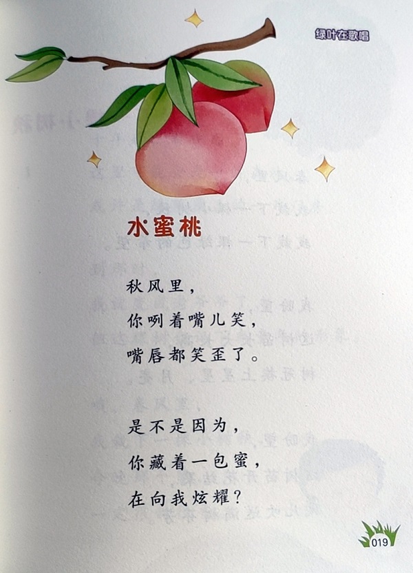 《绿叶在歌唱》是儿童文学作家郑世芳的儿童诗精选之作,共收录作者55首儿童诗作,其中像《打谷场》成为了“孩子的乐园,它像一张唱片,把欢乐的声音灌满”,在生动的比喻中,作者带领小读者充分地感受与拾取生活中欢乐的记忆,以成为内心的力量;像《蚕与蜘蛛》在“纺织竞技会上”,一个趾高气扬,一个默默牺牲……“牺牲自己为别人做丝”的当然是蚕,透过比喻和对比,作者循循善诱,使用诗意的语言引导小读者思考应该拥有怎样的人生。作者的诗作充满叙事的故事情节,多有比喻、拟人等修辞,充满哲理,引人思考,又不乏童趣