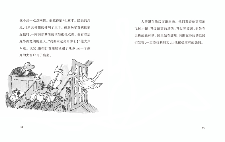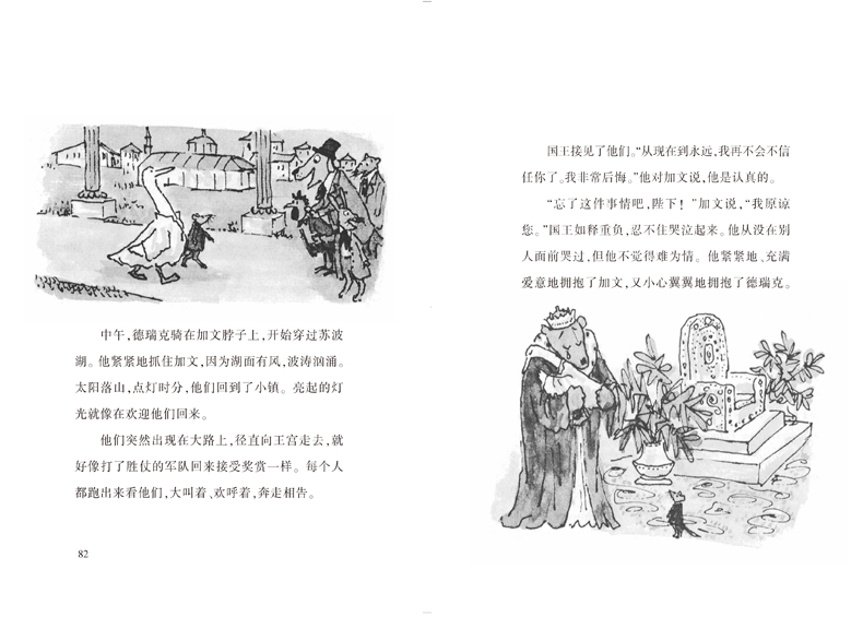在一次盘问中,加文的蹼深深地陷入国王的红地毯中,他感觉国王看他的眼光有点太锐利,应该说有一点怀疑。他颤栗着,两只纽扣一样的眼睛无辜地、坚定地注视着国王。他热爱这位高大、温暖、毛茸茸的国王,还有他那大大的毛耳朵和随意穿着紫色王袍的样子。他知道国王有些沮丧,但是他还是觉得自己被冒犯了。