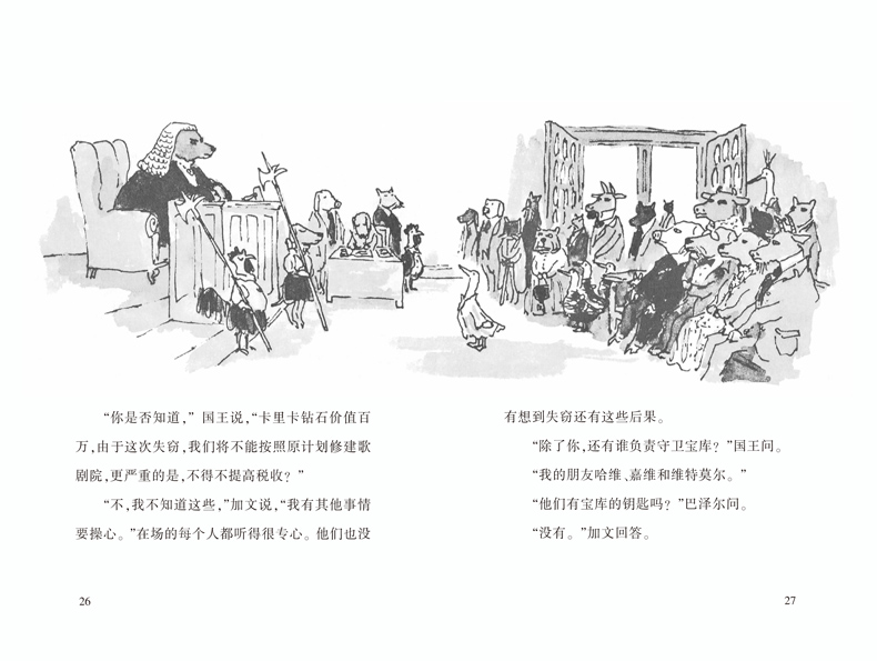“请求陛下您原谅我这么说,”他的语气里带有一点点讽刺的味道,“是否有可能是陛下您犯了一个高贵的错误?我谦卑地亲吻您温暖而毛茸茸的大脚,希望您不要认为我这样猜测是对您的不敬:是否有可能是您自己拿走了一些珠宝,但由于君王您责任重大、日理万机,所以完全忘记了这件事?”