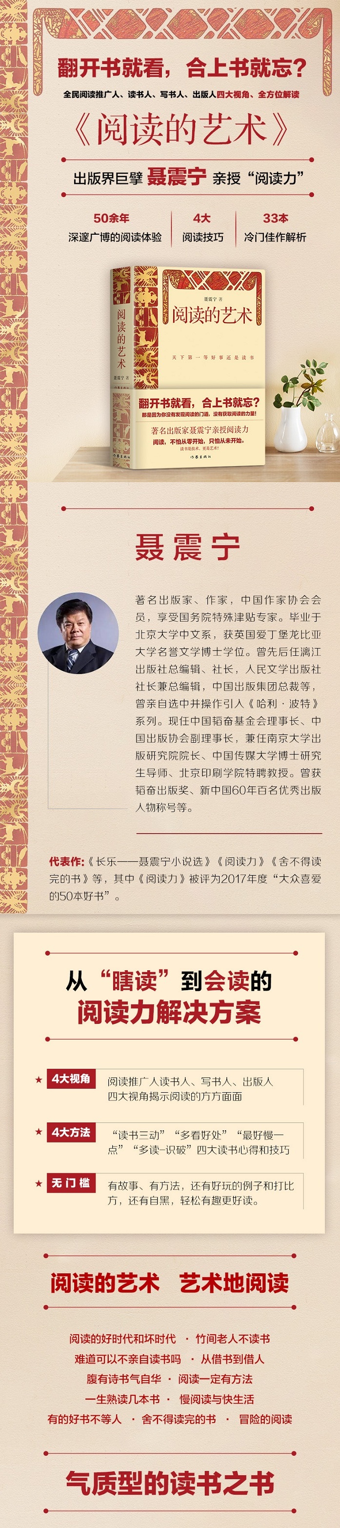 聂震宁,著名出版家、作家,第十、十一、十二届全国政协委员,中国作家协会会员,享受国务院特殊津贴专家。毕业于北京大学中文系,获英国爱丁堡龙比亚大学名誉文学博士学位。曾先后任漓江出版社总编辑、社长,人民文学出版社社长兼总编辑,中国出版集团总裁等,曾亲自选中并操作引入《哈利波特》系列。现任中国韬奋基金会理事长、中国出版协会副理事长,兼任南京大学出版研究院院长、中国传媒大学博士研究生导师、北京印刷学院特聘教授。曾获韬奋出版奖、新中国60年百名优秀出版人物称号等。代表作有《长乐——聂震宁小说选》《阅读力》《舍不得读完的书》等,其中《阅读力》被评为2017年度“大众喜爱的50本好书”。