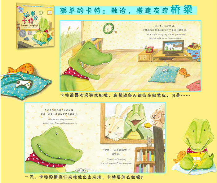 鳄鱼宝宝卡特阳光绘本·双语版,以鳄鱼宝宝卡特可爱造型为主人公,通过卡特的故事,将分享、尊重、诚实、爱好等主题引入其中,引导孩子如何培养良好的品质和性格。