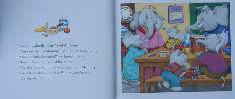 Mrs. Large isn’t feeling well, so Mr. Large sends her back to bed."I’ll take charge," he says. So while he and the children get busyvacuuming, dusting, and tidying, Mrs. Large settles down for a nicerest. But somehow ("I want my mommy!") Mrs. Large’s restful day(What’s that burning smell?) is not as restful as she’d hoped. Wisemoms, well-meaning dads, and their spirited offspring will alllaugh in recognition at this droll, expressively illustratedstory.