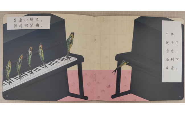 有好多条绿色的小鲱鱼,他们在和小鸟游戏,有几条鲱鱼呢?他们在和菲尼大婶嬉戏,有几条鲱鱼呢?他们在弹钢琴,有几条鲱鱼呢?他们开着拖拉机碰到了可怕的大熊,有几条鲱鱼呢?他们坐上了轮船,去了森林,他们……有几条鲱鱼呢?一共十条。