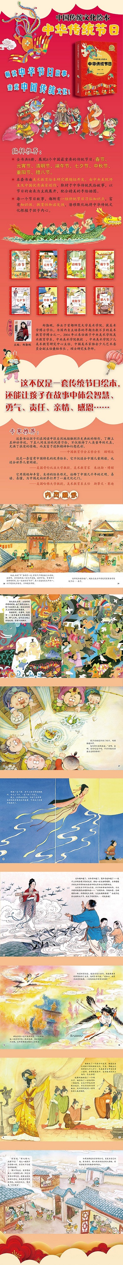 本套书由美术教育绘本研究课题组主编,中央美院师生及中国很好画家创作,取材于中华传统民俗故事,配合精美的绘本图文,让孩子们了解中国的传统文化。这套图书在插画、文字以及设计上保留传统精髓的同时,加入易于孩子理解的创新元素。本套书为国家“十一五”课题项目。内容包括:春节、元宵节、清明节、端午节、中秋节、重阳节、七夕节、腊八节。