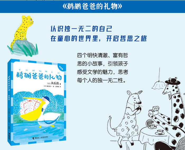 本书包含四个童趣盎然的小故事:《鹈鹕爸爸的礼物》讲述鹈鹕爸爸在马戏团工作,他的大嘴巴可以吹出无数美丽的泡泡,还能搭救落水的小猫。一天,他回到家,用大嘴巴给孩子们“制作”了一份特别的礼物;在《我厉害!》中,小狮子、小老虎、小豹子都认为自己是世界上厉害的动物,不肯服输的小狮子和小老虎跟着一只“大鸟”飞向了天空……这些故事明快清澈,富有哲思,插图灵动幽默,引领孩子感受文学的魅力,进一步思考每个人的独一无二性。