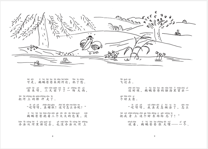 你认识鹈鹕吗? 鹈鹕长得很像鸭子,但比鸭子个头儿大。鹈鹕有一张大大的、灵巧的嘴巴,身体是白色的。 从前,有一只鹈鹕爸爸在城里的马戏团工作。 大大的嘴巴吸满肥皂水,噗!噗!噗!吐出去——这就是鹈鹕爸爸的工作。 噗!噗!噗!大泡泡、中泡泡、小泡泡,几百个泡泡,几千个泡泡闪着彩虹色的光芒,在马戏团帐篷里飘啊飘。 一到这个精彩环节,不管多么捣蛋的孩子,眼睛都会瞪得溜圆,叫起来: “哇!好棒啊!” 看到这么美丽的泡泡,谁都会高兴地叫起来。 有一天,鹈鹕妈妈给鹈鹕爸爸写了一封信: “孩子们很想你。抽空回一趟家吧!回家时,别忘了给孩子们带礼物。” 读完信,鹈鹕爸爸一刻也待不住了。 他立刻去请求马戏团团长:“请给我放几天假吧!我想回家看看孩子。” “当然好,当然好。”马戏团团长爽快地说。他马上给鹈鹕爸爸发了工资。 鹈鹕爸爸高兴极了。他立刻来到城里的商店,给两个儿子买了玩具火车和玩具飞机,给小的女儿买了可爱的布娃娃。 鹈鹕爸爸坐了十天船,又坐了三天火车,终于到了家乡村子的小车站。 鹈鹕爸爸再走三个小时,然后过一条大河,就能回到自己家了。孩子们正在家里等着他呢! 可是,鹈鹕爸爸来到河边,犯愁了……