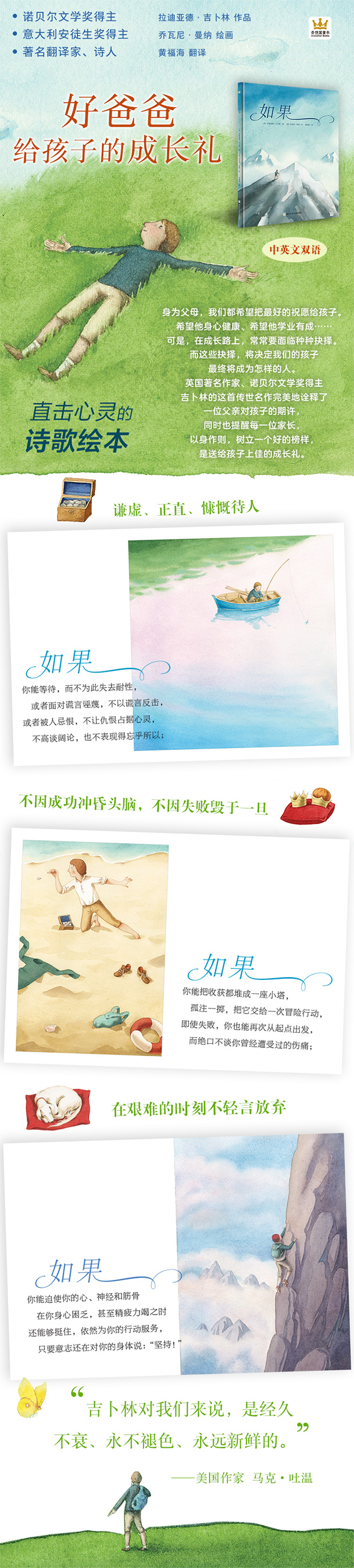 1909年,拉迪亚德·吉卜林创作了《如果》这首诗,寄语12岁的儿子约翰。几年后,约翰不幸死于“一战”中的一场战役。但是这首诗却成为一种激励,广为流传。近年来,这首诗两次入选“英国民众喜爱的诗作”。在这本描绘来自父辈的谆谆教诲的图画书里,意大利插画家乔瓦尼·曼纳用柔软而有力量的画笔,把童年的天真和吉卜林诗句间传达出的激励人心的情感,完美地融为一体。