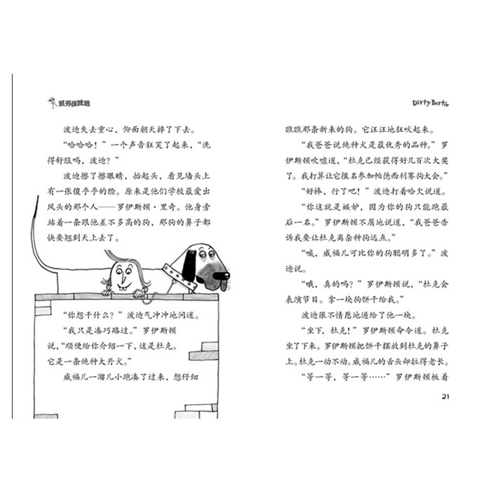 “脏”男孩波迪全10册,每册包含3个相互关联又相互独立的故事,篇幅适合课堂阅读练习。教师可参考以下阅读模式:从生动形象的插图导入,让孩子们初步感知人物,带领其从曲折的情节中感知文本,进而发散式引导孩子们猜测自己想象中的故事结局,*后引发阅读后的讨论。波迪的文本能很好地帮助教师践行这一阅读模式,因为每个小故事都有作者精巧的设计与构思,一波三折的你猜不到的故事结局,以及孩子们所熟悉的、真实细腻的校园生活和家庭生活的场景。