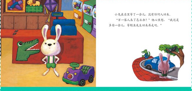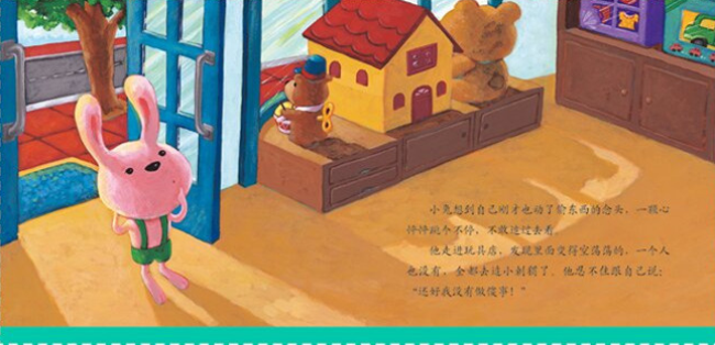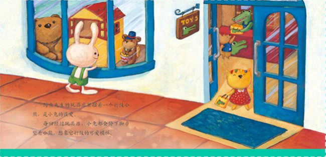 几乎每个人都有相同的经验:遇上喜欢、想拥有的东西,可是没有钱或因为其他因素,无法得到。因此,看到故事里的小兔把脸贴在鳄鱼先生的玩具店橱窗玻璃上、盯着小熊看时,爸爸、妈妈和孩子心里都非常容易引起共鸣,在怜悯小兔的同时,也忍不住同情了自己。