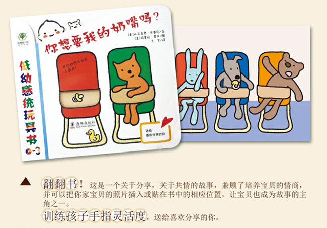 翻翻书!这是一个关于分享的故事,虽然眼泪是苦涩伤感的,但分享是甜美快乐的。这个故事的主角们就像很多小朋友一样,爱奶嘴,爱哭,也爱彼此,孩子是*善良纯真的。