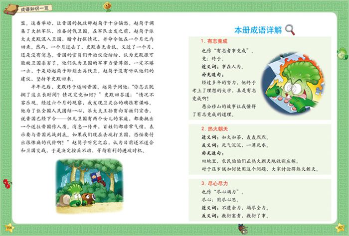 5.本系列图书囊括了人教版和苏教版小学1~6年级语文教材里收录的成语,并按照由易到难、由低年级到高年级的顺序进行编排。这样精心的设计实用、方便,非常适合小学生的实际需求。…………