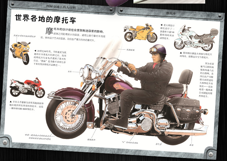 《摩托车》一书讲述了摩托车的时空转变,从维多利亚女王时代以汽油为动力的自行车讲到现代高速赛摩以及让人心跳加速的超级摩托车,详细描述了各个时代的摩托车外观、科学原理、制造过程及其背后的发明故事。