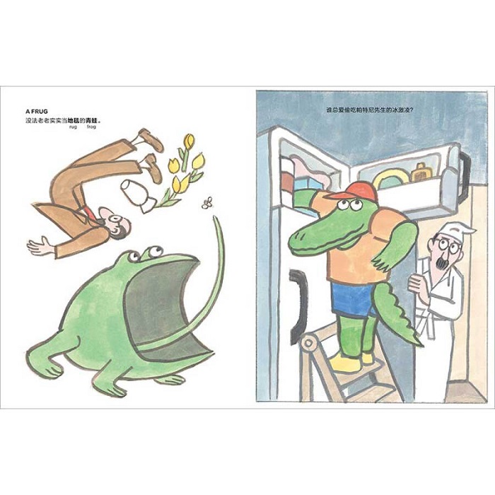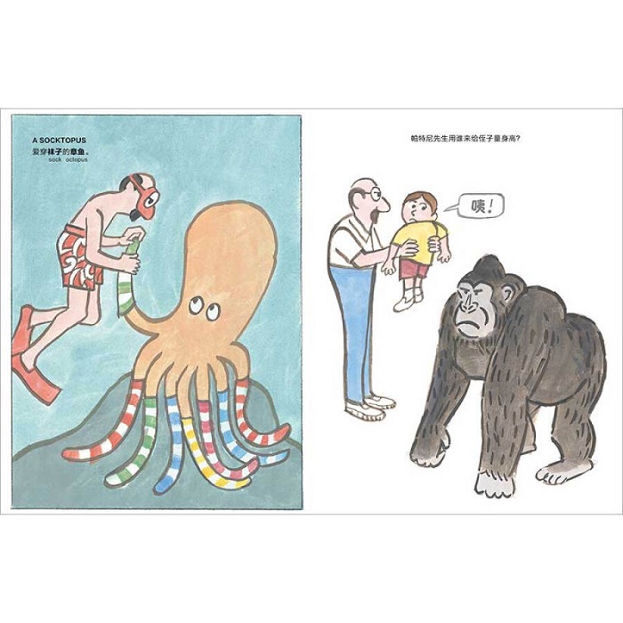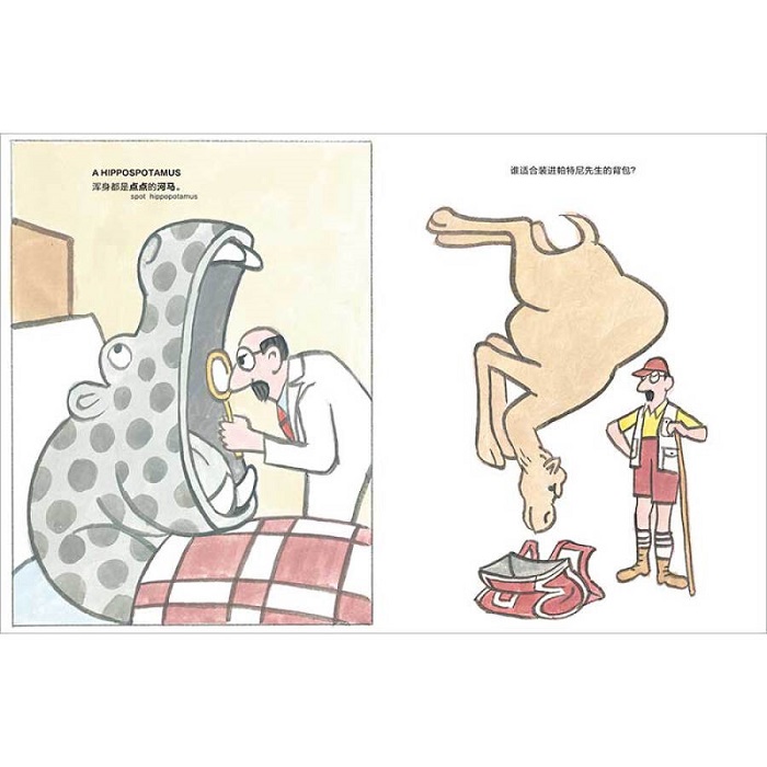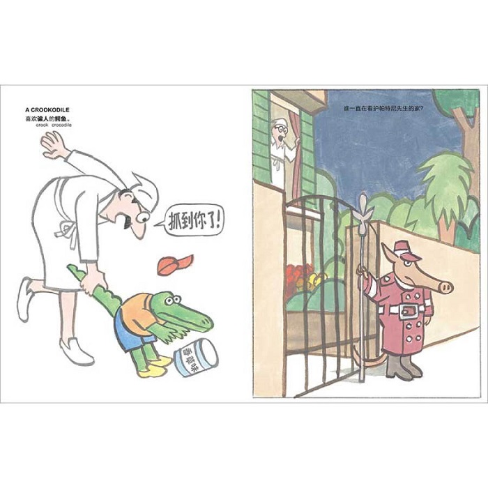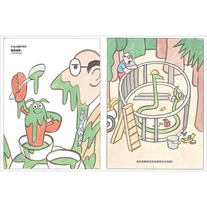《帕特尼先生的嘎嘎狗》是一本幽默风趣的睡前读物,也是一本趣味十足的中英双语书。帕特尼先生穿着绿西装,打着红领带,戴着眼镜,一副不苟言笑的样子。这个一本正经的人会有哪些与众不同的动物朋友呢?或许,眼尖的小读者会从扉页上感受到一丝不同寻常的气息:帕特尼先生正在遛一只嘴形奇特的狗,旁边那只普通的狗害怕得毛都耸立起来了。随着翻页的进行,接踵而至的奇妙动物不断突破着小读者的想象:紧盯着时钟的犰狳是专属闹铃,怕冷的章鱼每只脚都要穿上袜子,顶着小房顶的长颈鹿在关键时刻为帕特尼先生挡雨,挞龟因为长得太像小点心所以差点被吃掉(好在它大喊一声:“停!”,才避免了悲剧),大象这个庞然大物却是捉迷藏游戏的永远赢家,因为他总是隐隐约约的、让人看也看不清。帕特尼先生和他与众不同的动物朋友度过了充实的一天。夜晚来临,他躺在温暖的床上,甜甜地睡着了。看看床头那只犰狳,我们都知道第二天会发生什么。 这是一个幽默而温暖的故事,它让读者哈哈大笑、拍手称赞的同时,也让他们感受到想象力的奇妙。