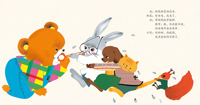 《小熊拔牙》这是一个关于卫生习惯养成的小故事。小熊贪吃还不喜欢刷牙,后果带来的是牙齿生病必须拔掉,可小熊的牙齿还真难拔,在小伙伴的努力下,终于拔掉了……这个故事看起来比较说教,但是作者用了儿歌的语言表达,充满幽默感,让孩子容易接受。