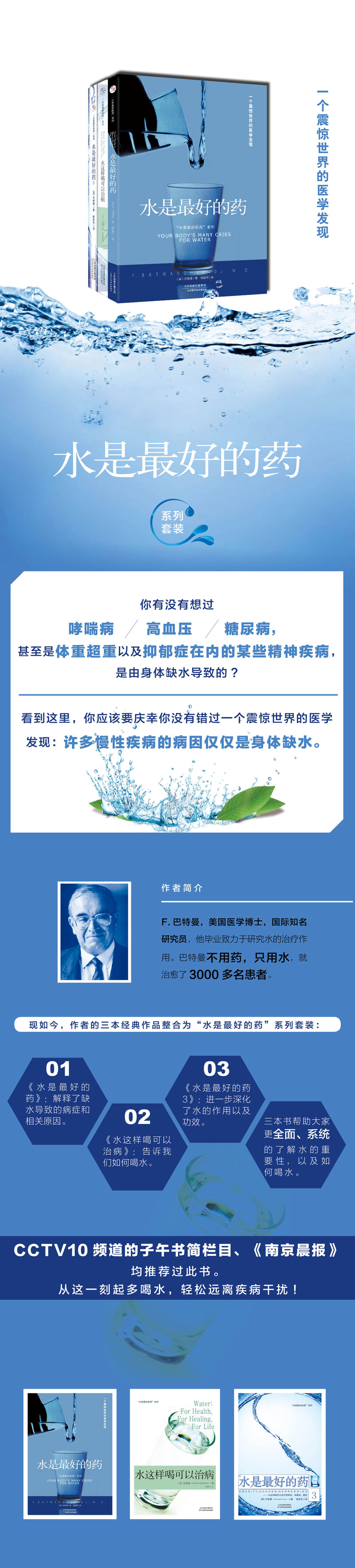 2.作者是亚力山大·佛莱明——盘尼西林的发现者和诺贝尔奖得主——的学生。他毕生致力于研究水的治疗作用。他根据自已多年的临床经验,发现了一个震惊世界医学界的秘密——许多慢性疾病的病因仅仅是身体缺水。这些疾病有:哮喘病、过敏症、高血压、体重超重、糖尿病以及包括抑郁症在内的某些精神疾病。