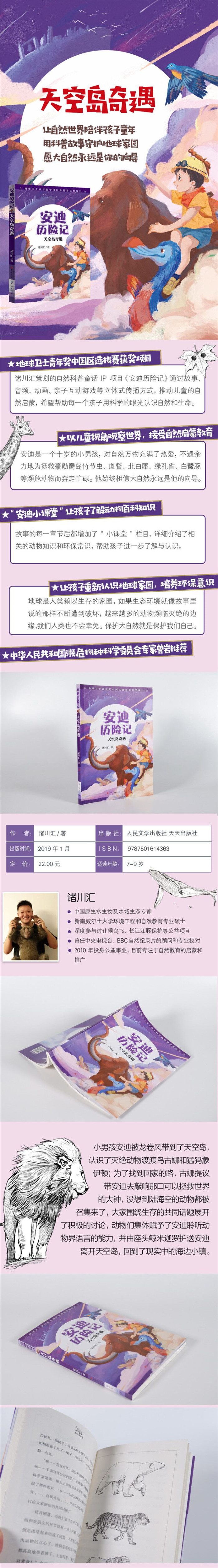 “安迪历险记”是国内首部原创的自然科普类幻想小说,科学性与艺术性兼具,讲述了主人公安迪小朋友竭尽所能,保护地球上各种濒危动物的故事。情节紧凑,文字浅显易懂,每一章节最后设有“安迪小课堂”板块,介绍相关的动物百科和动物保护专业知识,教育孩子从身边做起,培养保护生态环境、爱护动物的意识。 本册《天空岛奇遇》作为故事的缘起,开篇介绍了天空岛的传说,引出故事的主人公小男孩安迪被龙卷风带到了天空岛,认识了灭绝动物渡渡鸟古娜和猛犸象伊顿;为了找到回家的路,安迪敲响了那口可以拯救世界的大钟,没想到陆海空的动物都被召集来了,场面一度混乱;好在最后有惊无险,大家围绕生存的共同话题展开了积极的讨论,作为人类的小安迪答应帮助大家,为大家找寻世上现存的同类动物,保护大家避免遭遇灭绝的危险;最后,动物们集体赋予了安迪聆听动物界语言的能力,并由座头鲸米迦罗护送安迪回到了现实中的海边小镇。