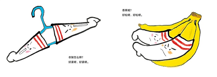 袜子很想被小主人穿上,但是最近小主人总穿新袜子。因为太想被人穿上,失落的袜子去为自己寻找新的主人:衣架、香蕉、雨伞……谁会是最适合的主人呢,好像谁也不合适。终于,有一天,小主人又选择了自己,他要穿上自己去哪里呢?