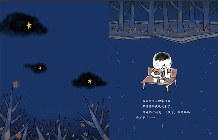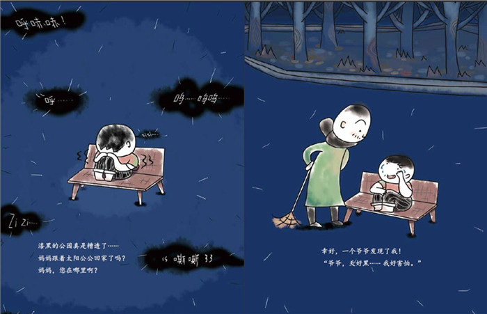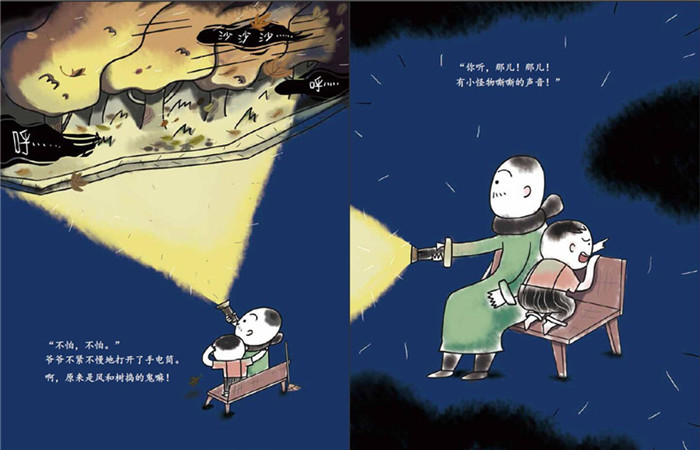 太阳公公回家之后,黑漆漆的夜晚就来了。公园的长椅上,和妈妈走散的小孩,害怕得哭了起来。黑暗的公园里,各种怪物,呜呜咽咽,悉悉索索、嘶嘶簌簌、咚咚啪啪……太让人害怕了。幸好有打扫卫生的爷爷,爷爷还有个手电筒。爷爷打开手电筒,黑夜之中的怪物都露出了本来的面目……黑夜竟然也有那么美丽的一面。