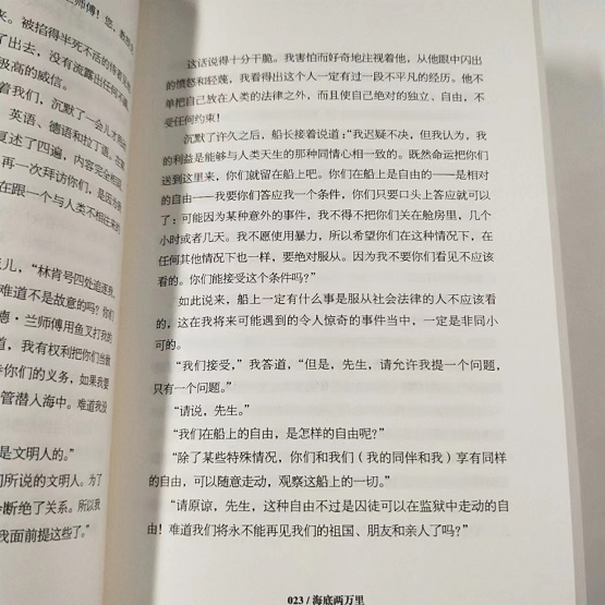 《海底两万里》这部小说,描写的是法国博物学家阿罗纳克斯教授和尼摩艇长在海底深处旅行的故事。他们游历了世界许多海洋,饱览了海底变幻无穷的奇异景观和形形色色的生物, 经历了种种危险。小说悬念迭出,高潮频起,趣味盎然,在引人入胜的故事中蕴含着鲜明的爱憎和广博的地理知识。